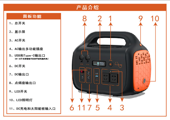 - از شارژ و دشارژ همزمان پشتیبانی می کند. کاربردهای وسیعی دارد. می توان از آن به عنوان منبع تغذیه آنلاین UPS یا به عنوان منبع تغذیه پشتیبان اضطراری در فضای باز استفاده کرد. این می تواند تجهیزات پزشکی داخلی، چاپگرهای کوچک، لامپ های مختلف، بخاری های مخزن ماهی کوچک، نوت بوک ها و کمپینگ در فضای باز را ملاقات کند. در مواقعی مانند عکاسی، اضطراری آتش سوزی، امداد و نجات اضطراری و امدادرسانی در بلایای طبیعی، از آن برای روشنایی و منبع تغذیه AC استفاده می شود.