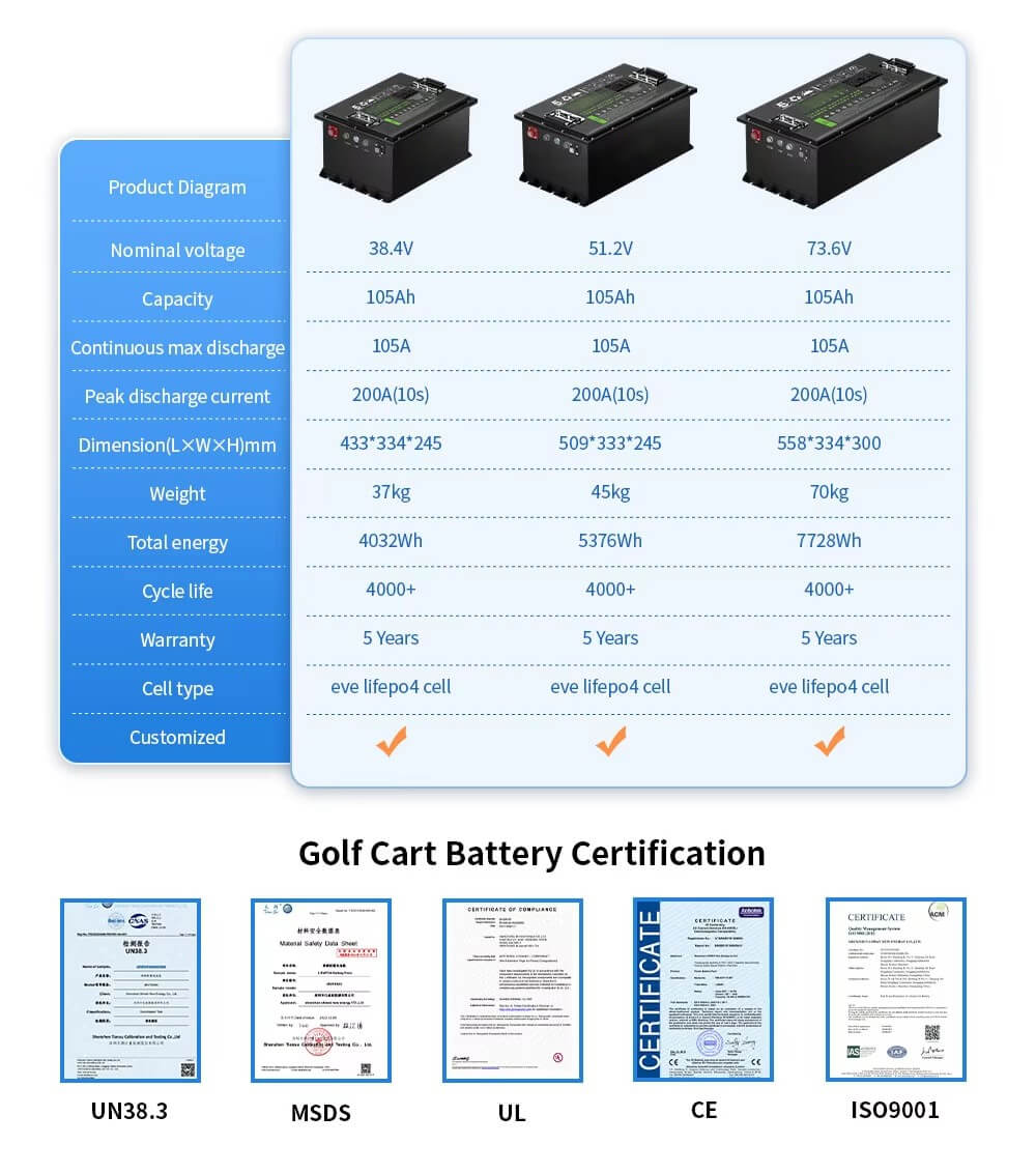 【مانیتور هوشمند باتری LCD】ALL IN ONE lithium golf cart battery offers robust acceleration and performance, enabling users to conquer challenging terrain and extend their golf range up to 50 miles on a single charge.