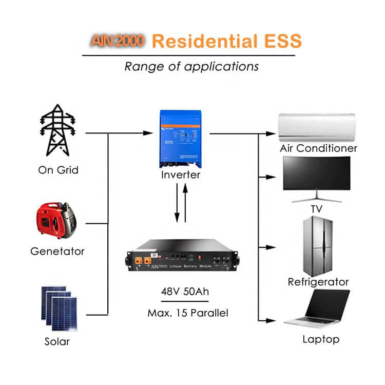 1. باتری سیستم خورشیدی AIN2000 48v با عملکرد بسیار بالا LFP cell 3.2V 50Ah و EV استاندارد ساخته شده است تا ایمنی و عمر مفید برجسته را تضمین کند.