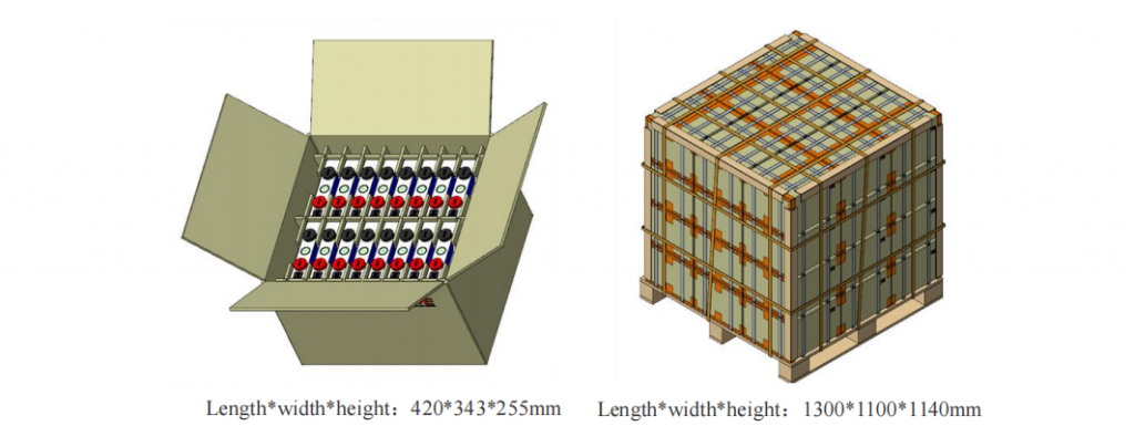 سلول ها باید در جعبه هایی با شارژ 30% تا 50% SOC بسته بندی شوند. در طول حمل و نقل، آنها باید از لرزش شدید، شوک، اکستروژن، خورشید یا باران محافظت شوند.
